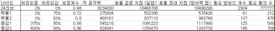 难度-隐藏伤害加成-隐藏伤害减免-修正系数-敌人的攻击力-效率骤增点(到线)-效率最大点(到线)-需要的彩格子-需要的金蜡笔