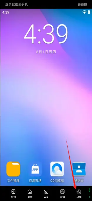 1、进入云手机,点击底部【功能】按钮,打开操作弹窗