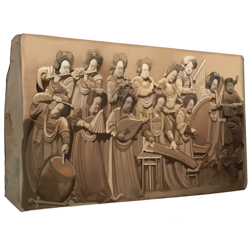 本源介绍 五代时期彩绘浮雕作品。1995年出土于河北曲阳。浮雕中有15人,表现了乐队演奏的生动场面。最前列的女子身着男装,似为乐队指挥,右下角有两位男性,或在队前导引。其后12位演奏者皆是女子,都身穿长裙,头梳高髻、簪珠花,有唐代女子之体态余韵。整块浮雕线条流畅,惟妙惟肖,体现出曲阳石雕的高超技艺水平。现藏于河北博物院,为镇院之宝。 | |||||