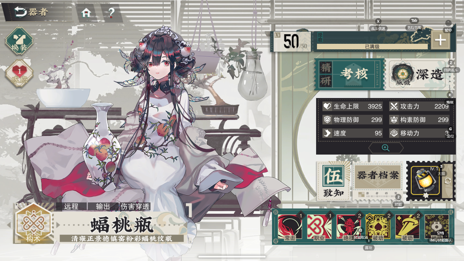 蝠桃瓶必练,30开深造可以轻松过很多前期本,开荒巨猛。新手活动免费送满命,后面有想用的构术可以换,没有可以一直用到毕业,活动有练蝠桃瓶的要求。她机制简单粗暴,伤害高,群伤c,杀人回能,是前期非常好的群伤构素c,在没有红卡群伤大c的情况下,她就是最好的!而且这个练度越高越强,能打到很后面的关卡。