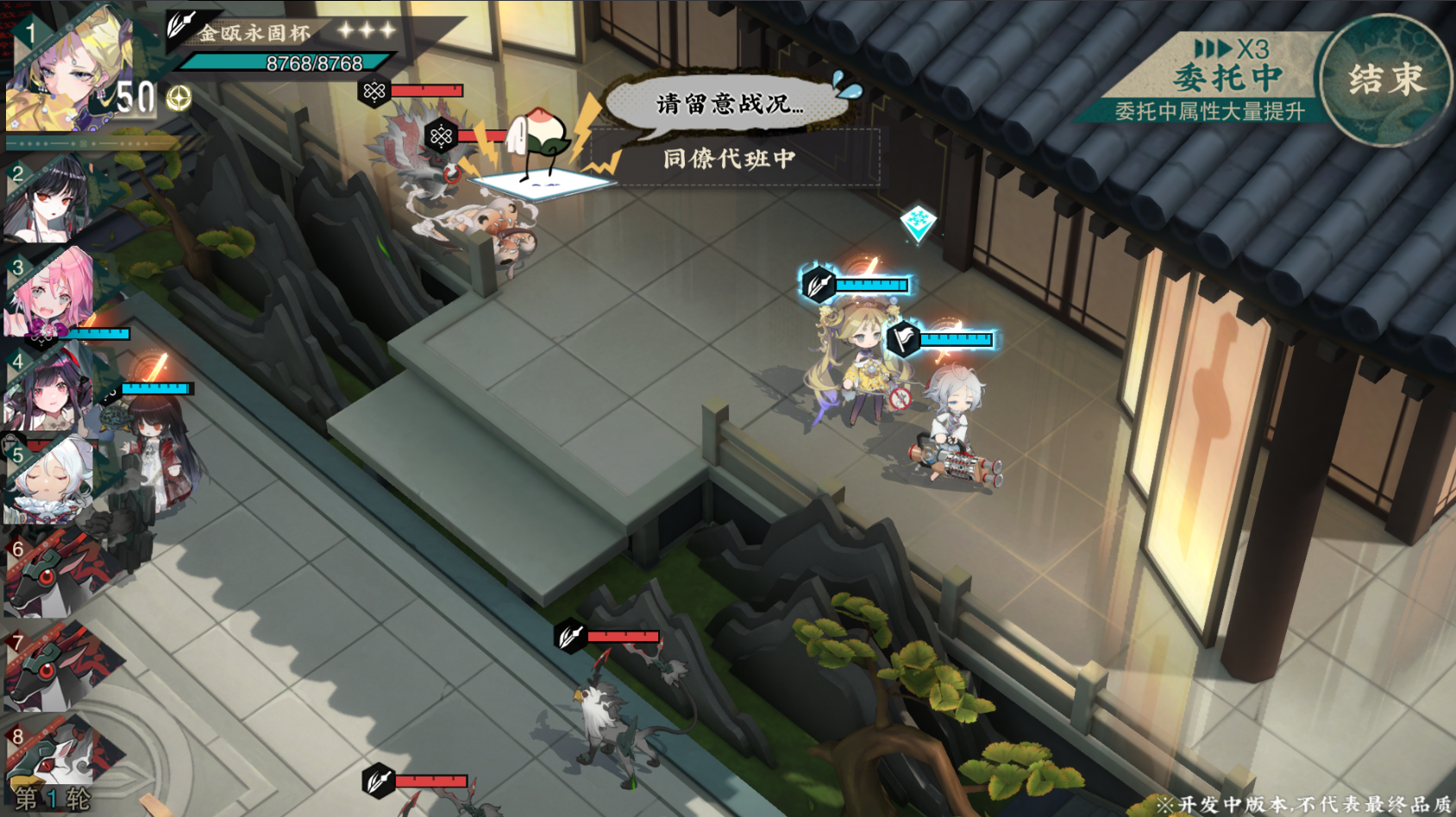 物华弥新是战旗类的游戏,队伍里可以上6个人(带上T字帛画能有8人口),玩法并不复杂,一个角色有平a,职业技能,绝技(大招),和三个被动,战斗时除非有额外回合,不然每个角色只能动一次,选择一个技能释放。又因为战棋类战斗相对繁琐,这个游戏目前的自动al又是一坨屎,所以对手操有一定需求,不过整体也不算困难,因为战斗流程比较流畅,所以打的比较久也不会累。