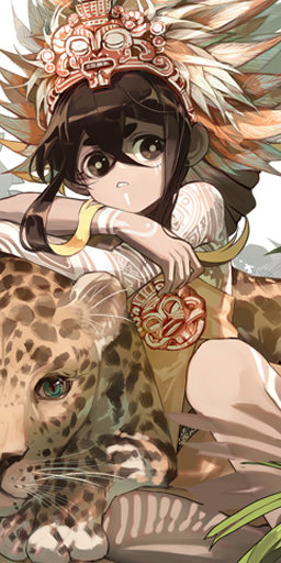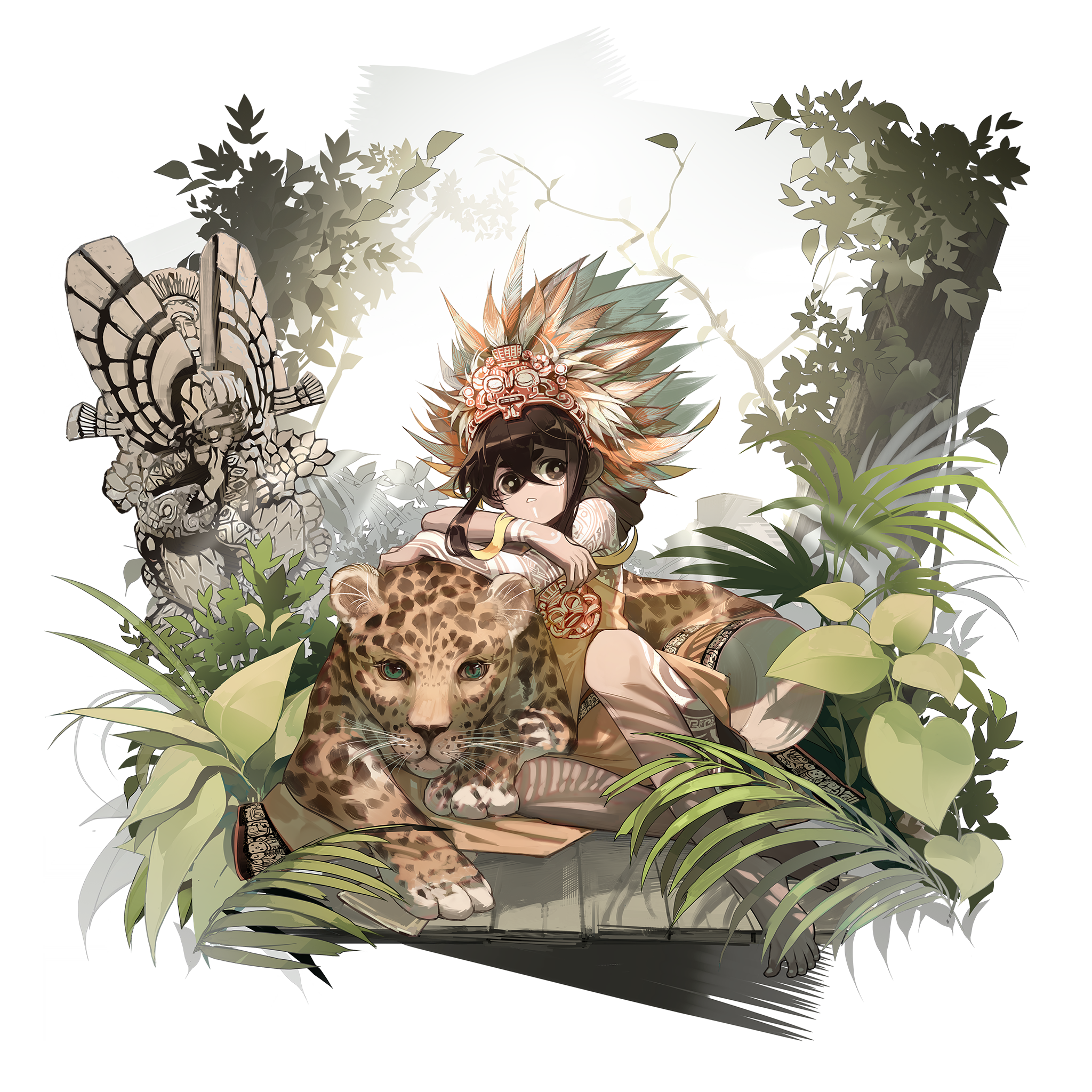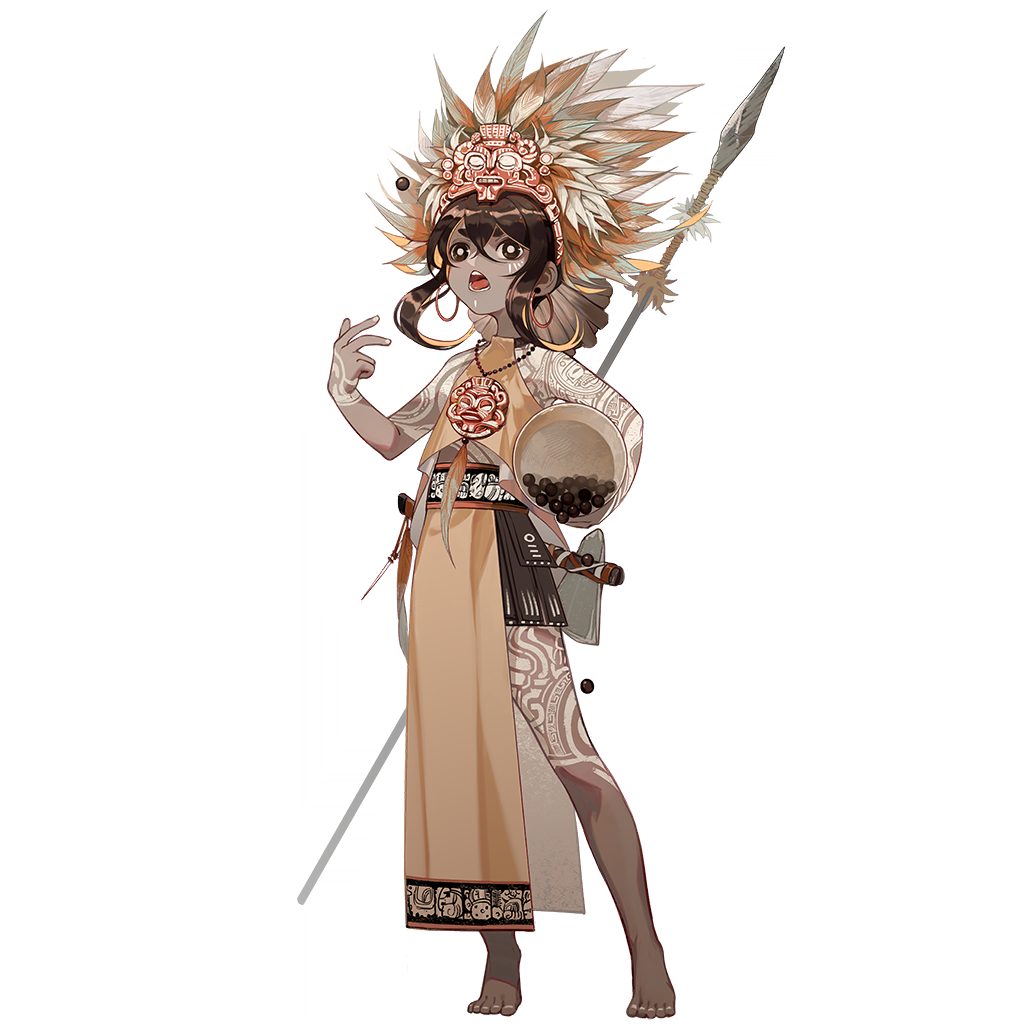 器者外现为皮肤黝黑的玛雅少女,头戴羽饰,身纹复杂图腾,熟悉古老而神秘的文化,对现代文明的一切都非常陌生好奇。持长枪,反应灵活,有美洲豹一般的机敏和矫健。随身携带巨大巧克力碗,视可可豆为生命,会习惯性地用可可豆与人交易。"