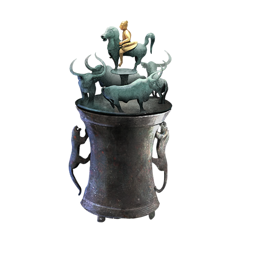 本源介绍 1956年出土于云南省石寨山。器身作束腰圆筒状,两边有虎形耳。器盖中间立着一位身份显赫的鎏金骑士,他椎髻佩剑,骑着威武的骏马。器盖周围还立体雕刻了四只牛,腰肥体壮,造型逼真。贮贝器主要用于盛放当时用作货币的海贝,作为云南青铜文化的特有种类,在世界中独树一帜。现藏于云南省博物馆。 | |||||