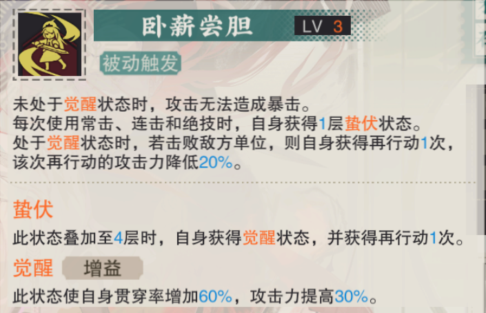 只有进入觉醒状态才能触发被动的高额爆伤加成,所以在战斗中尽可能让越王勾践剑在蛰伏回合击杀是操作的关键点。