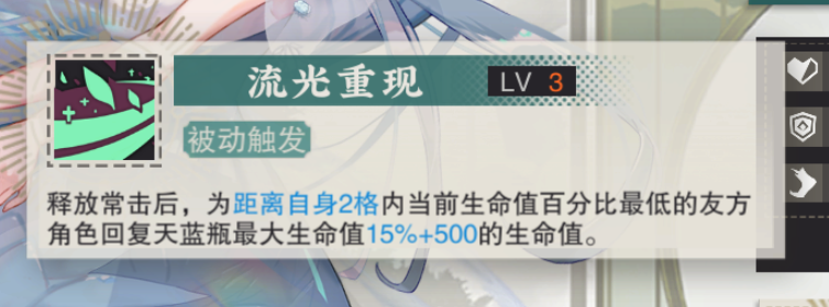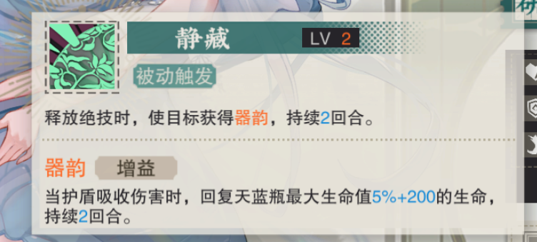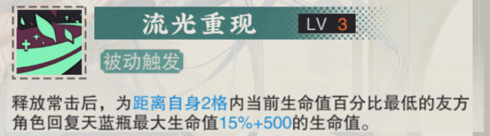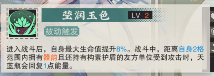 天蓝瓶前期赠送的金色治疗角色,治疗量与自身生命相关。因为常击可以回复队友血量,所以不会出现因为能量或技能CD而挂机一回合的情况。与贾湖骨笛类似,她在常击触发治疗的时候还会额外回复范围内低血量角色的生命值,但因为没有低血量情况下的额外增幅,所以整体奶量还是不如贾湖骨笛的。绝技群奶的同时还会提供构素护盾,虽然只能抵挡构素伤害,但在拥有护盾和【器韵】的角色收到伤害时,会额外给天蓝瓶回复能量,很适合利用拥有援护技能的宿卫角色来触发。