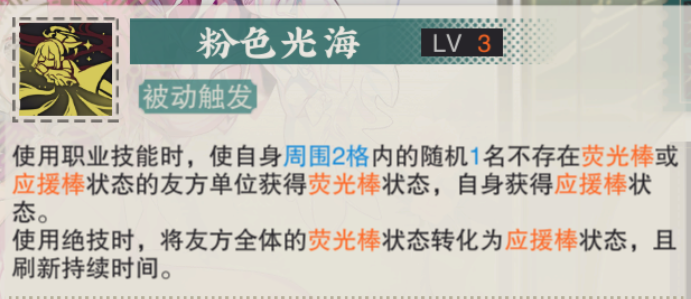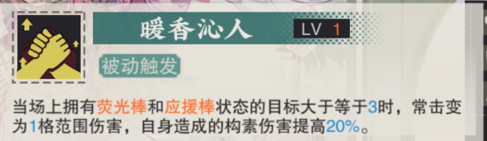 需要注意的是,她的大部分增益都与荧光棒/应援棒状态有关,令更多队友处于增益状态能够提高构素伤害。