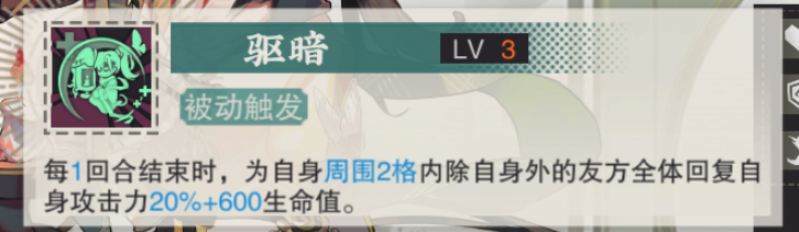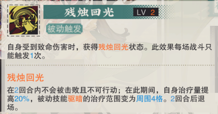 长信宫灯烧血的范围治疗角色,职业技能可以扣自己的血来回复周围全部队友的血量,在每回合结束时还会回复周围队友的血量。虽然没有回复自己血量的手段,但拥有两回合的免死,在此期间虽然不能主动扣血,但每回合结束时都有一次大范围的群体治疗,只要在两回合内结束战斗,就不会触发减员,自然也不会降低关卡评分。