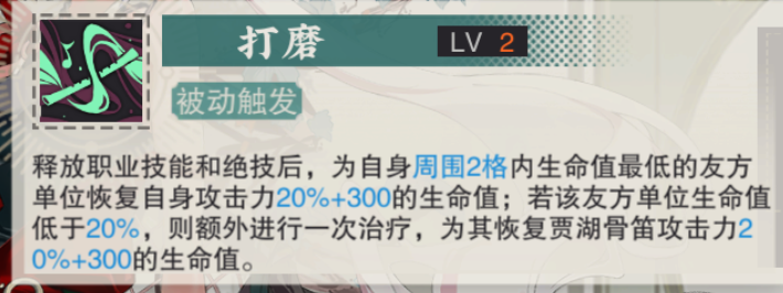 以攻击属性为核心的治疗角色,职业技能在治疗时可以同时回复范围内生命最低友方的生命,可以做到同时奶两个角色,在敌人无法直接秒杀你的情况下,即使丝血,也能配合被动做到一口奶三次(职业技能+最低单位+20%)。