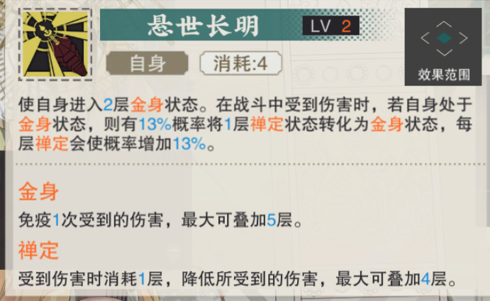 除此之外,通过使用职业技能还能获得【禅定】状态,获得最高40%的减伤。在消耗禅定时还可以回复生命值,适合大多数场合使用。