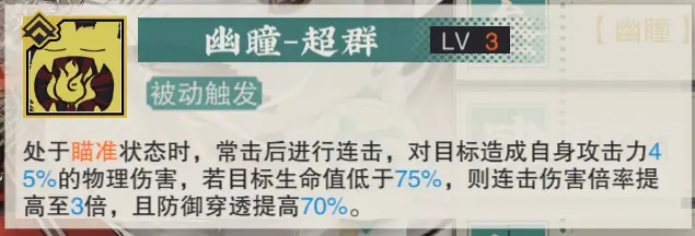 缺点:在攻坚打boss和面对超越练度的高血量敌人时比较乏力,因为这些敌人血厚没法靠被动秒杀无限瞄准。狸猫盘自身的被动又会使不开瞄准时平A对残血敌人打不出伤害,这时候就需要队友补伤害,但狸猫盘本身速度快,行动顺序靠前,所以会手感不太好。
