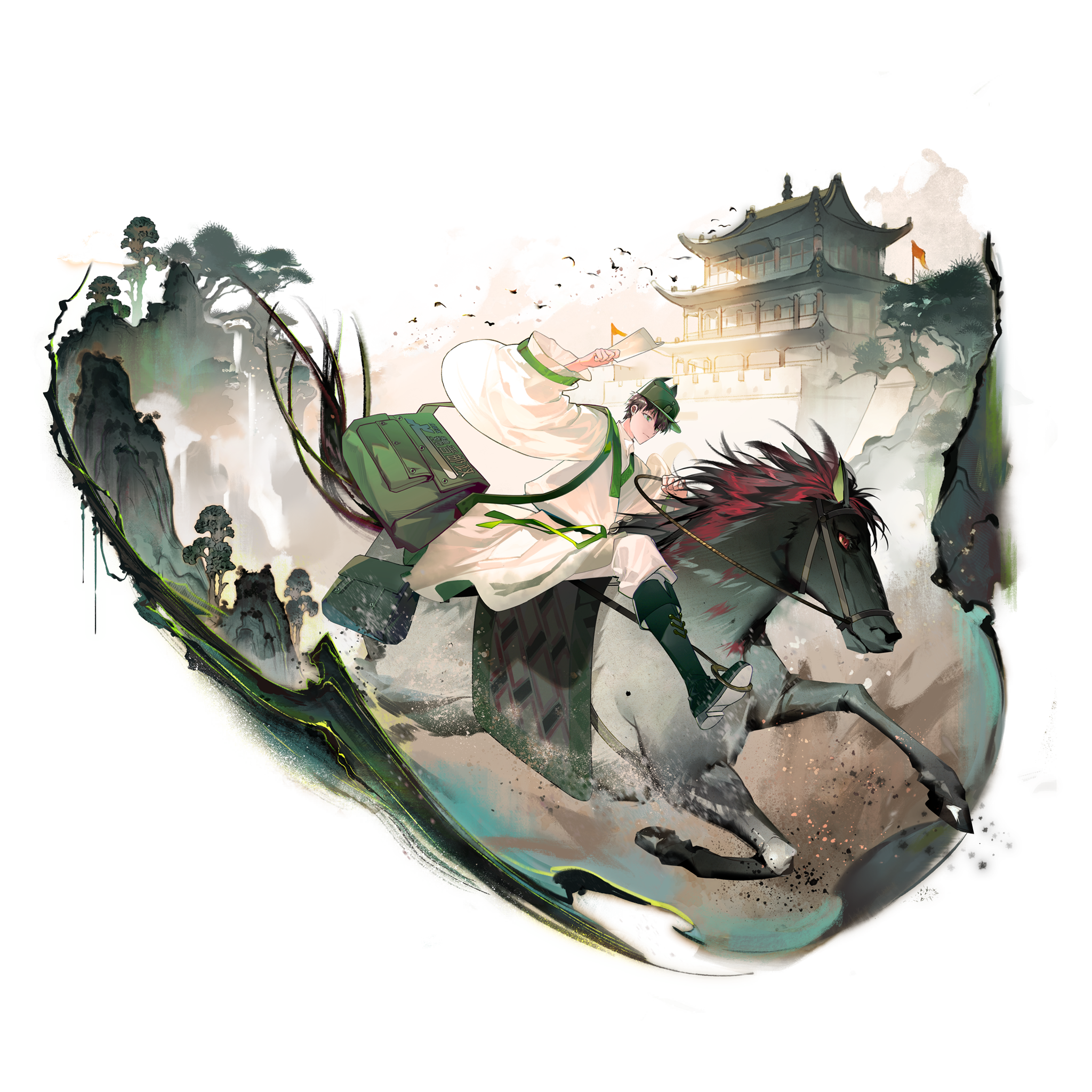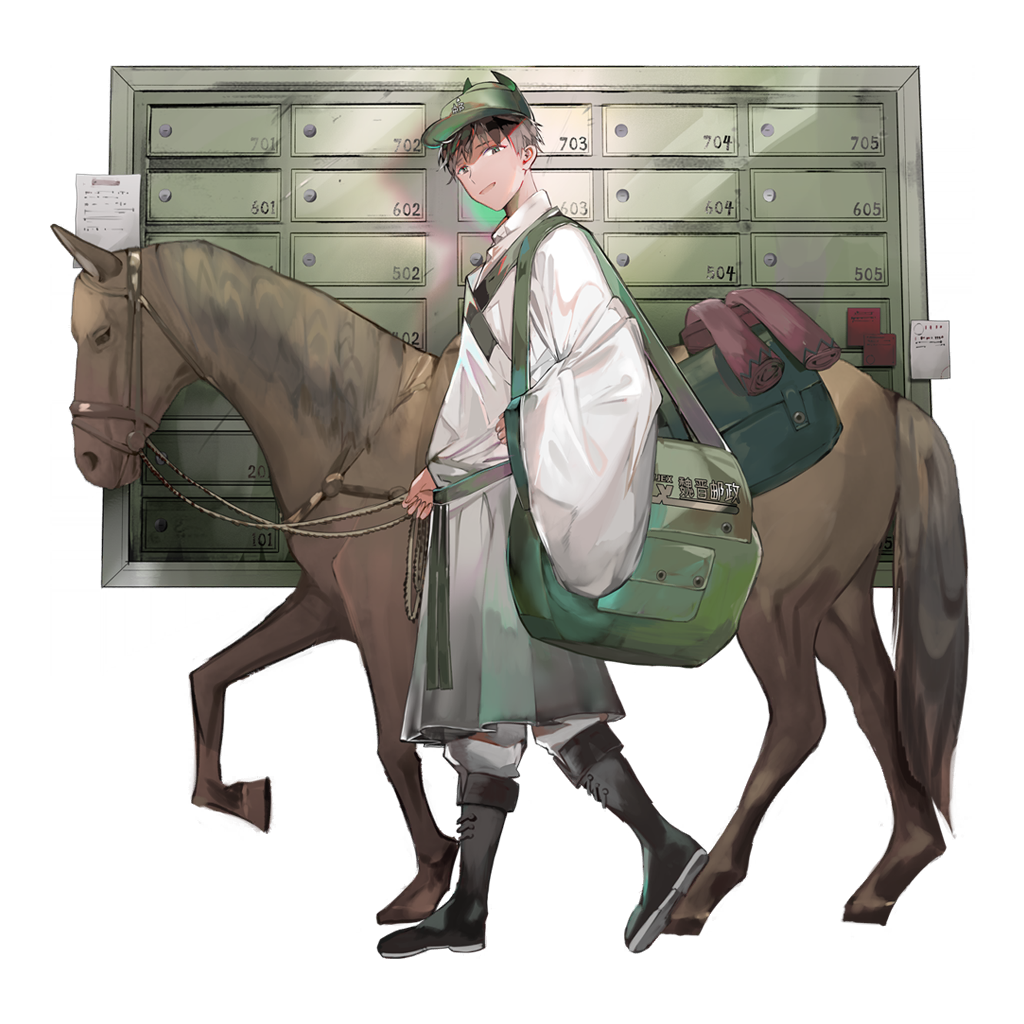 器者外现形象为一名骑马的青年。中国邮驿历史悠久,邮驿所传递的消息不仅有军机国事,也有民间信件,是非常重要的通信方式,而原画中的驿使形象没有口,象征着“守口如瓶”。器者性格中也留有此种时代印记,为人热心,富有责任感和保密意识,在运送工作上使命必达。当然工作风格也比较守旧,坚持骑马运送,但器者本身具有的异常能力可作出一定补足。推荐进入商业部。注意,在有较强度邮递任务的情况下,该器者的体型和外表风格会产生较大的变化,请注意不要认错。