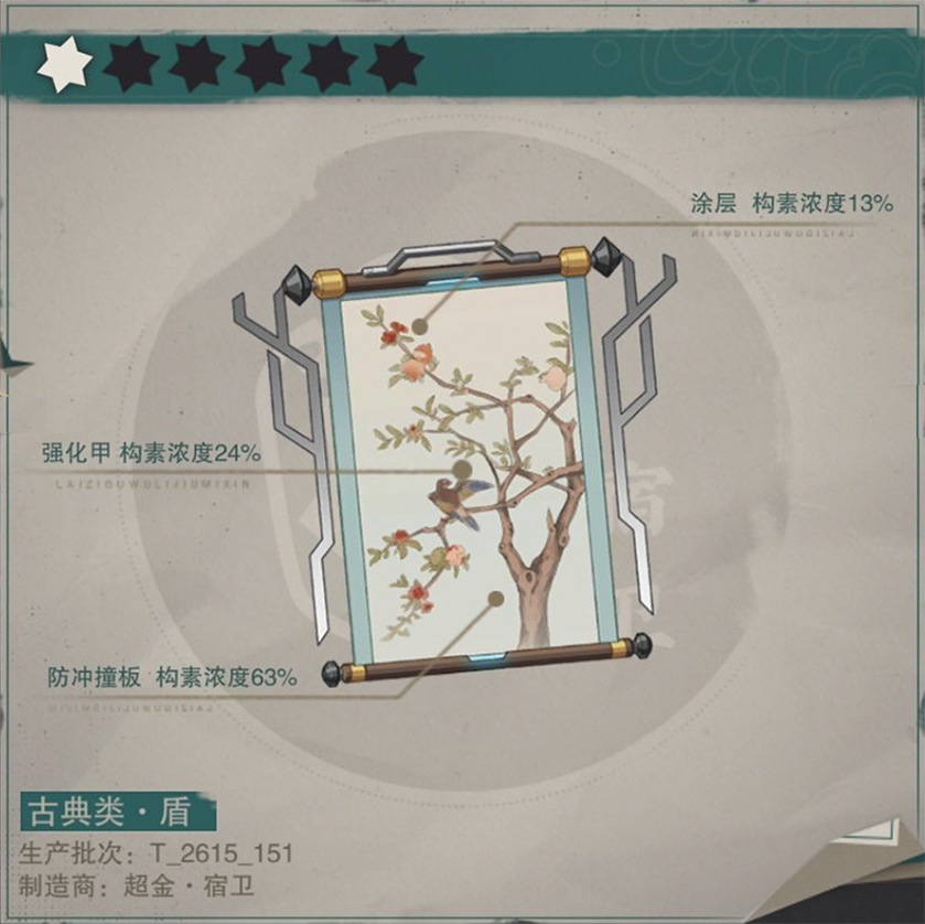 树枝清雅,花苞微绽,暮光悠悠。鸟儿在画中展翅,形意逼真,尽显活泼......本来只是一幅画,被设计师征用拿来印在盾牌上,还用科技骨架裱了起来。防御力?应该很高吧......