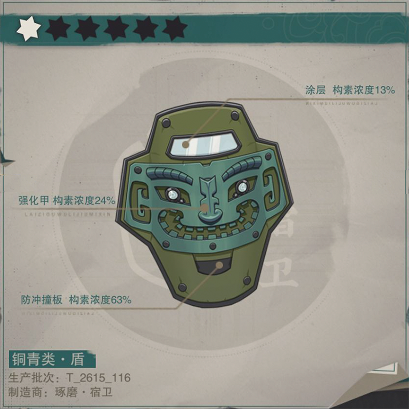铜青盾 基础信息 铜青盾品质炽职业宿卫类别盾重量8.3KG特性仿青铜/严密分子层装备概念装备攻击力200~1028生命值550~3147技能-青铜石装备者使用职业技能后,格挡率增加12%/13%/14%/15%/17%/20%,效果持续1回合。获取方式琢磨装备描述概念性装备,锤走偏锋,悬鼻獠牙,诡谲古拙。在实验阶段,该装备的造型让部分器者产生了强烈的情绪,于四川地区使用时请多加小心。获取该装备制造图纸需较高权限。 推荐人物 芙蓉炉