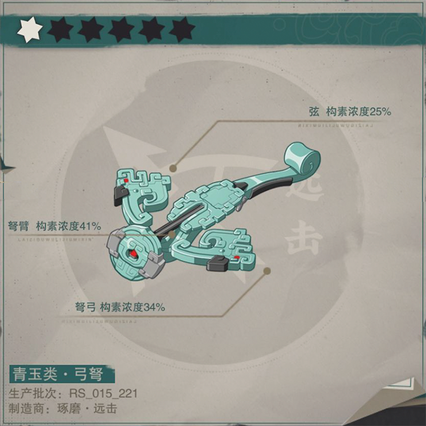 古人“载青旂,衣青衣,服青玉”,而今以青玉为装备,取其碧青高洁之意,制成如意弓弩。弩箭锋利,锐不可当,愿君以此弓征战四野,还我辈文明一方安稳。