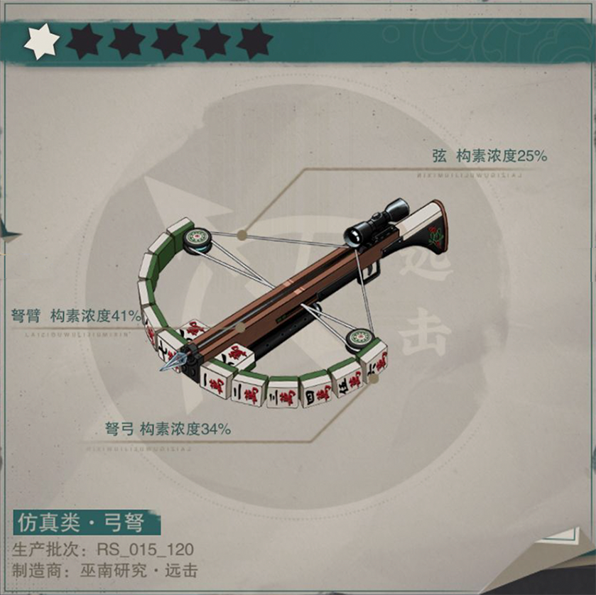 麻雀牌弩·耀 基础信息 麻雀牌弩·耀品质耀职业远击类别弓弩重量2.8KG特性轻量级/灵活便携装备模拟装备攻击力184~893生命值380~2152技能-麻雀天胡装备者速度增加5/6/7/8/9/10。获取方式巫南研究所装备描述秉持经典,尊重国粹,该装备诞生自某个彻夜未眠、哗啦啦声阵阵的夜晚之后。又名清一色复合弩,纪念一次难忘的胜利。每位麻将爱好者都有权购买制造图纸的商业授权。 推荐人物
