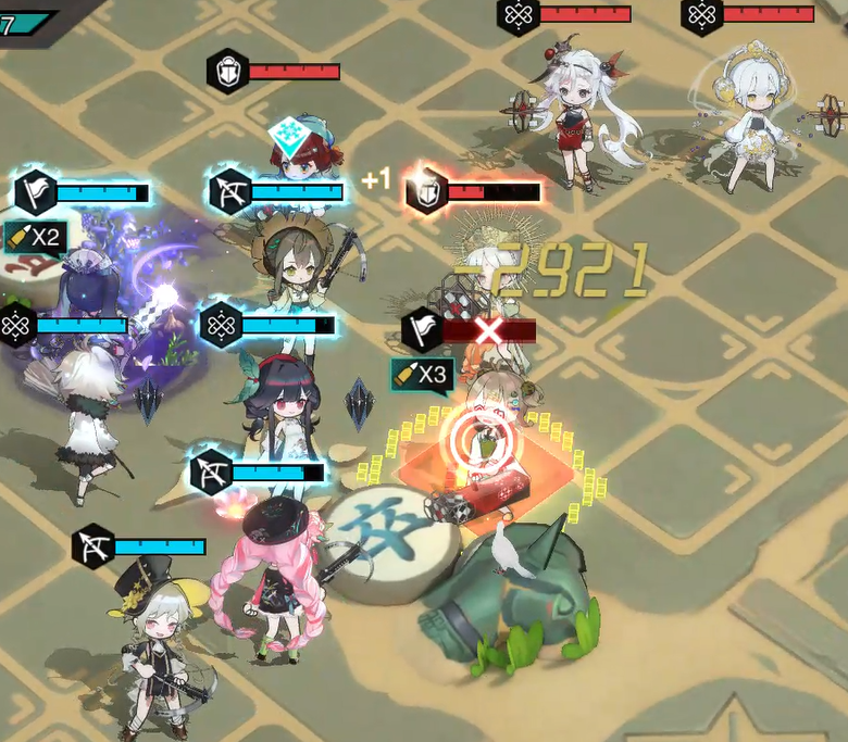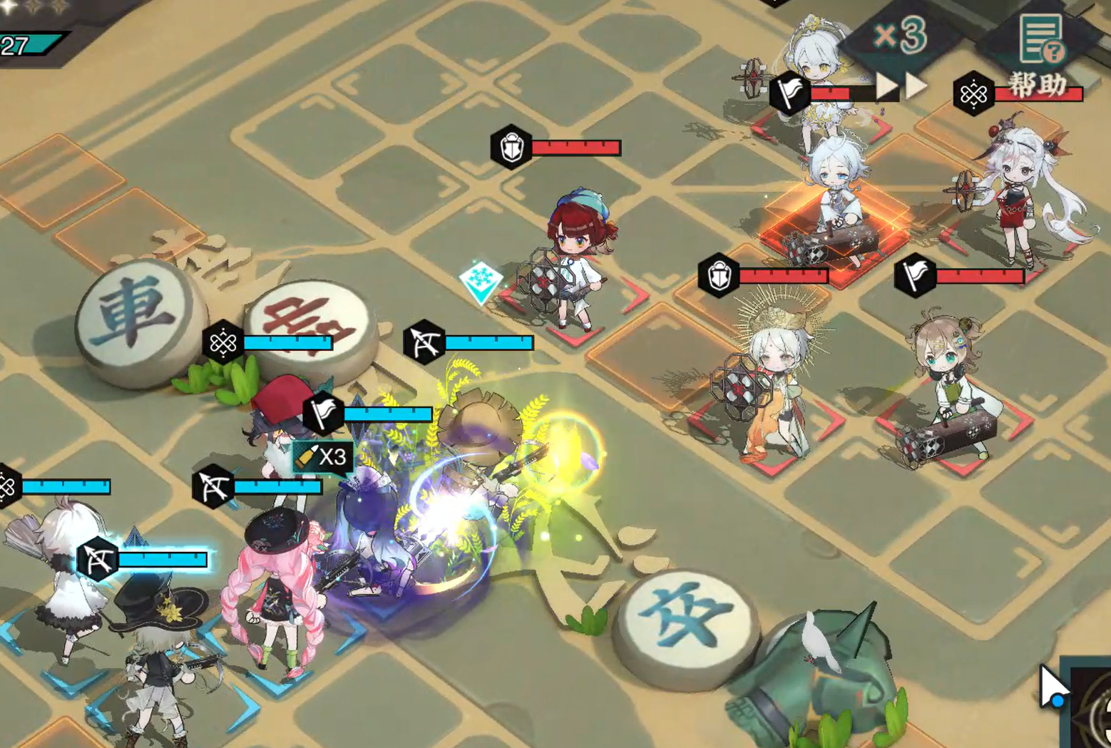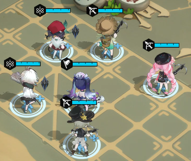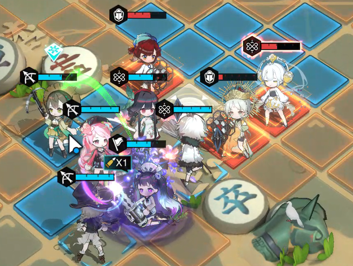 第一回合结束时我方站位如图所示,粉白双耳瓶移动到最远距离后开警戒,三位远击器者需要开瞄准打五星出东方,这是后面打掉五星出东方的关键所在。蝠桃瓶和芙蓉炉移动到指定位置即可。本回合五星会主动上前,粉白的战略攻击可以收掉残血的五星。