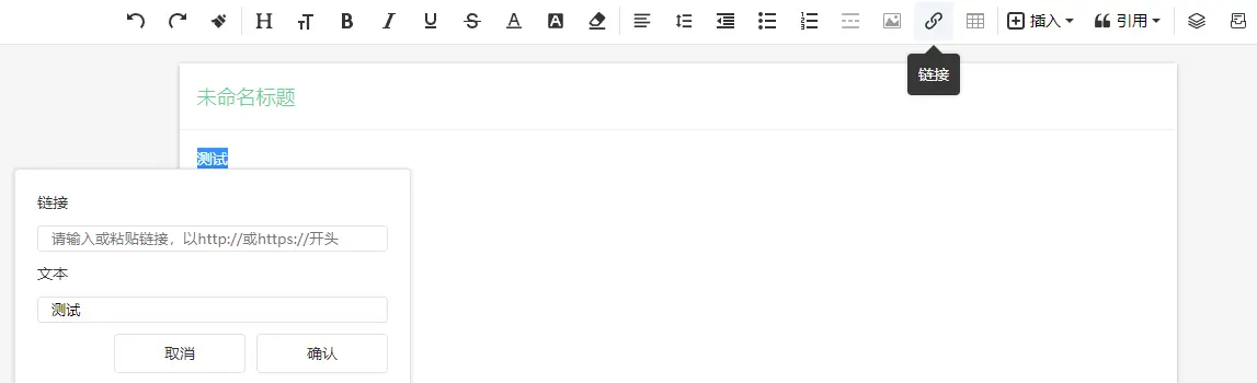 鼠标选中需要添加超链的文本(表格内的文本也一样),然后点击【链接】即可配置跳转地址