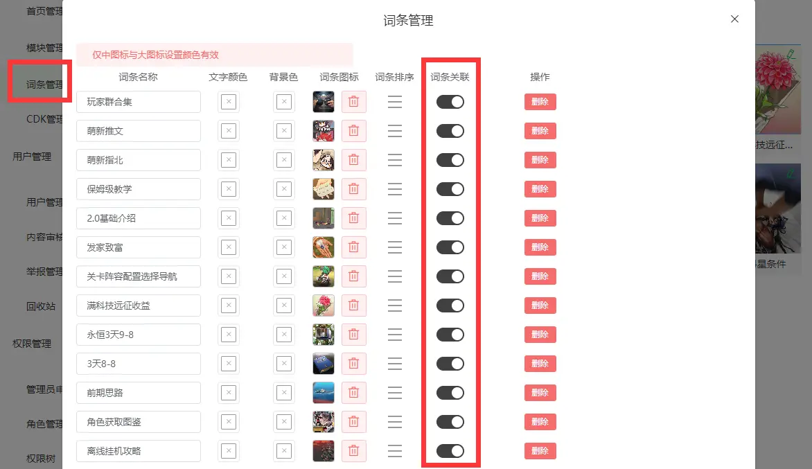 后台-词条管理,可以控制单个词条开启或关闭该功能