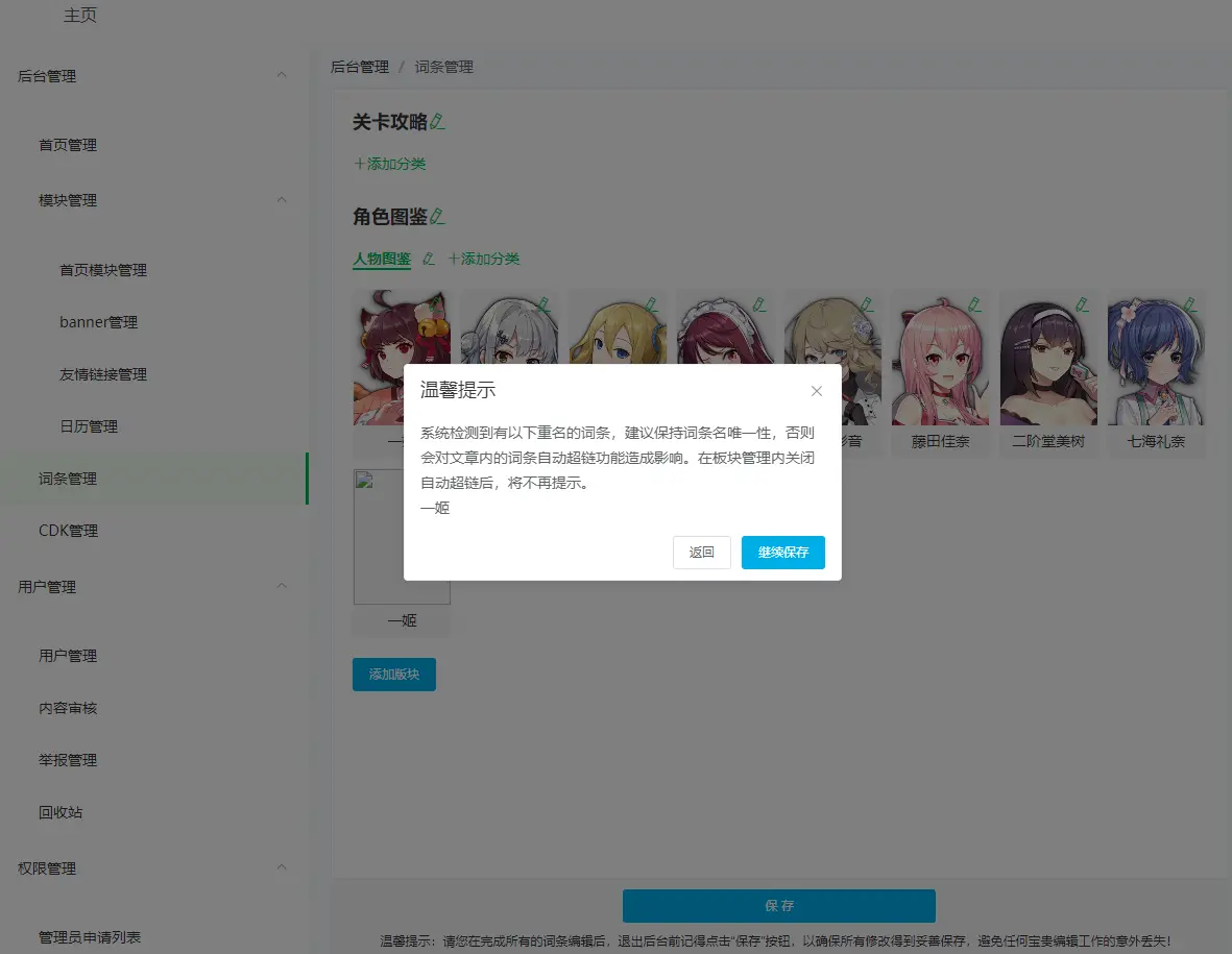 所以我们需要先确保词条名的“唯一性”,当我们在后台-词条管理时,系统如果检测到有“重名”的词条,会如下图提示。
