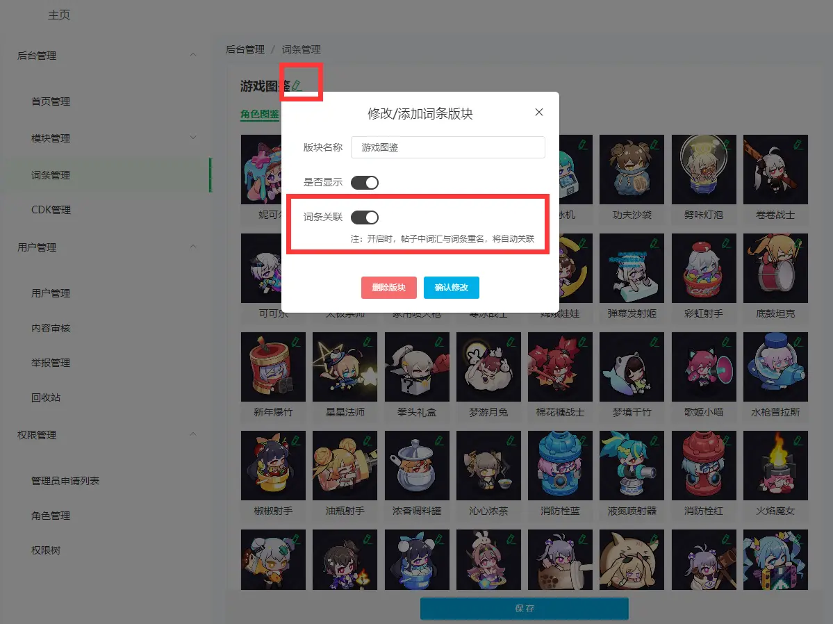 例如某个板块下的所有词条你都不需要自动关联,就可以直接关闭该板块的词条关联功能。