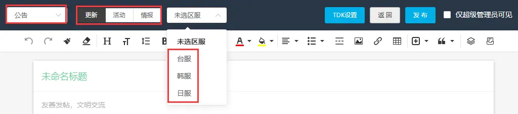 (1)你在社区正常发帖的时候,顶部菜单栏选择公告-公告类型-服务器,这篇贴子就会自动出现在公告板块