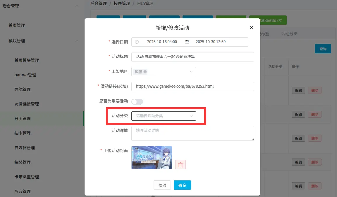 在后台-日历管理-设置活动封面尺寸,只能选定一种尺寸,不能混用。