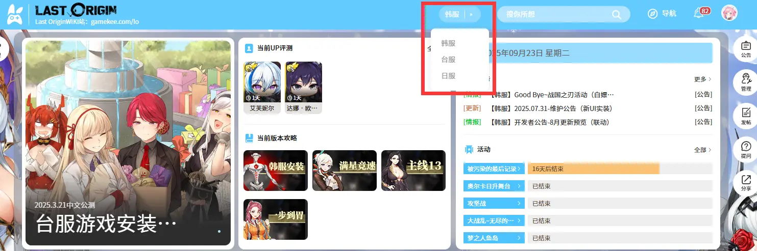 (2)配好后,用户即可在前端如下图这里切换服务器,切换后,【当前UP评测】【当前版本攻略】【公告】【活动】都会随时变化,所以你有多少服务器,就要配置多少套对应的内容。