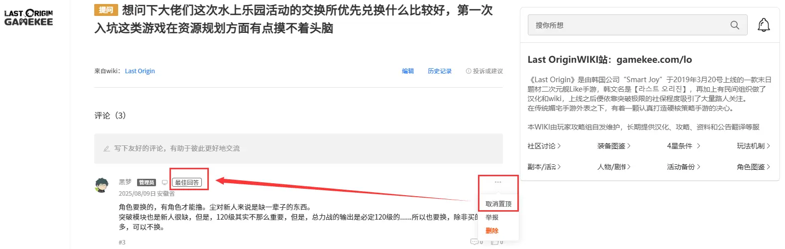 (2)【提问】贴内的评论,如果被管理员设置为【置顶】,该条评论就会被置顶且显示【最佳回答】标签。
