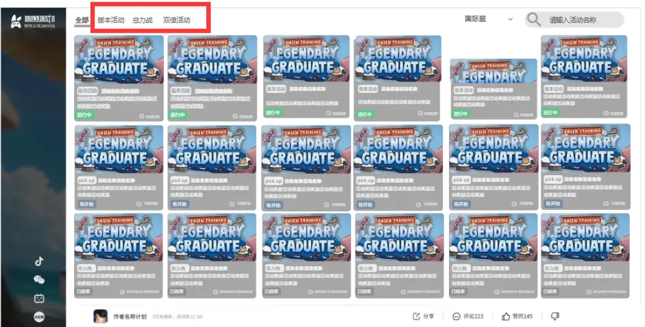 注意:该套皮肤是针对抽卡游戏设计的,【当前UP评测】、【当前版本攻略】、【公告】、【活动】是固定板块,必须配置内容且无法隐藏板块。改版后无法切回传统皮肤。