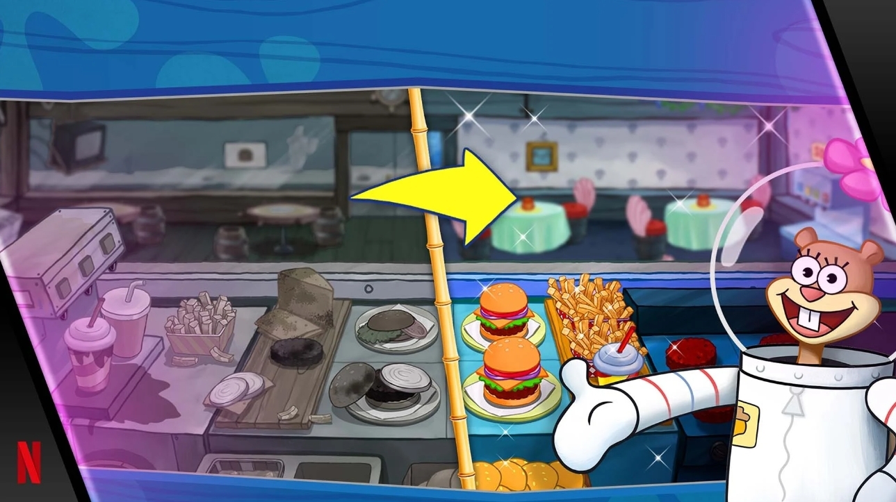 - 提升排名:准备好制作美味蟹堡、松饼、烤肉等众多美食了吗?派大星、珊迪奇可和章鱼哥等众多熟面孔都会来光顾。卖力取悦客户,就有机会赢得小费、按赞数和超棒奖励。从菜鸟炸物厨师开始练功,努力成为比奇堡数一数二的特级速食大厨。