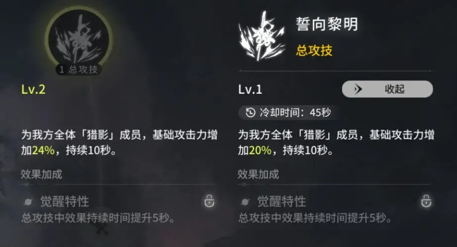 月蚀总攻技满级时,可以提升我方全体【猎影】40%的攻击,持续15秒。