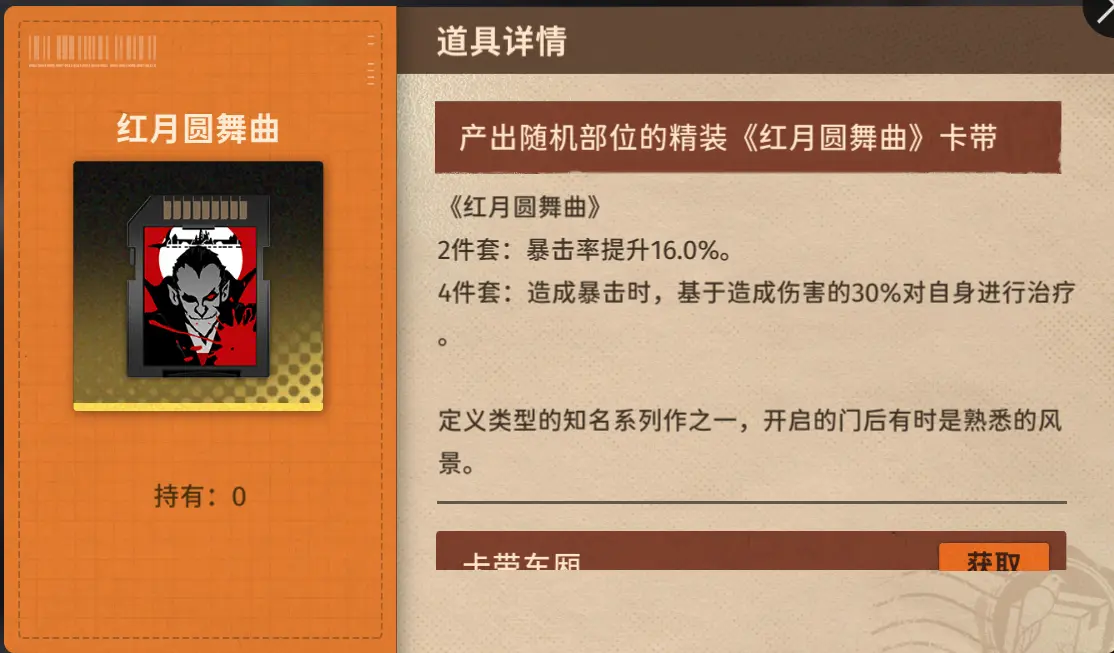 需要注意的是,【剪影格斗】和【红月圆舞曲】这两种套装有着不同的使用情况,如果采取的是二拐一的阵容搭配思路,有较高的暴击率加成和能级回复的情况下,可以选择使用【剪影格斗】四件套;如果生存压力较大,可以选择【红月圆舞曲】来提供一定的自我治疗能力,缓解生存压力。