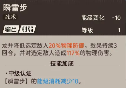 一个可以无视20%防御力的单体输出技能,也是龙井的主要输出技能,无视防御力的机制类似于战术技,也是基于敌人当前防御值计算的,可以吃到【瞬雷步】的减防加成。