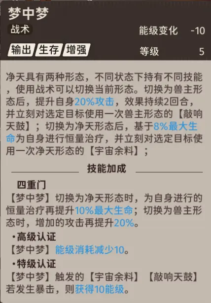 0门机制完全,1门增加25双爆非常逆天。2,5门阶是面板数值提升,3门额外增加被动的数值,4门是切换形态后的加强,上文提到净天形态非常鸡肋,所以提升不大。