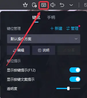 点击模拟器上方键盘图标,在“显示按键提示(F12)”中可以选择开启/隐藏按键提示。