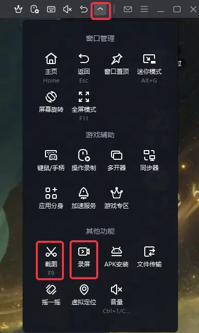 展开模拟器右上角菜单栏即可使用截图功能【默认快捷键F9】与录屏功能,还能设置录屏效果噢!