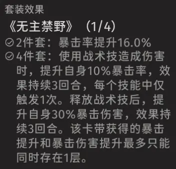 【技力】释放战术技后,若本次战术技消耗能级在20点及以上,则提升自身3%暴击伤害,效果持续2回合。
