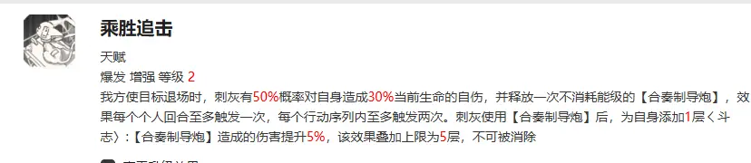 核心机制是天赋,简单来说就是击杀后概率释放大招追击,但是有30%生命值的自伤,每回合最多两次。这里的追击算大招伤害,可以吃到【剪影格斗】和4【恶灵公馆】的加伤,所以刺灰必须优先升级大招,最好是有多高拉多高!
