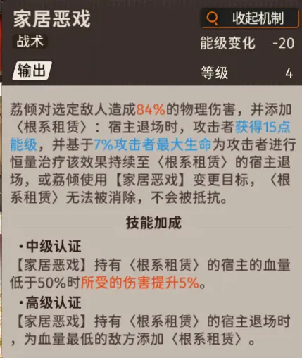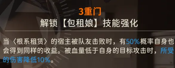 相当于超限技和战术技的一个结合,这里需要补充一个机制说明,解锁了高级认证之后,支援技添加的【根系租赁】宿主退场之后,不会给血量最低的角色添加【根系租赁】。(这个机制其实在战术技能的高级认证描述里面有说,但是还是单独测试了一下)