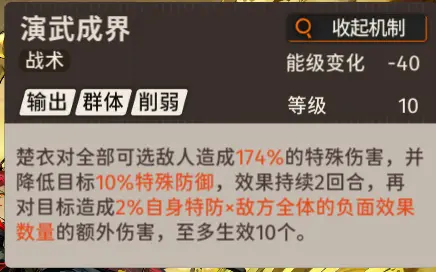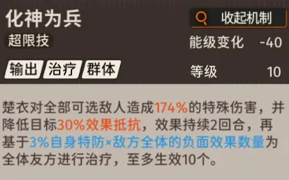 总结:【楚衣】的战术技和超限技都会消耗四十能级,从这一点来看,二者的地位是持平的,同时也代表了,虽然【楚衣】有减少特殊防御和降低效果抵抗的能力,并且伤害倍率相同,但是受限于能级的缘故,这两个DEBUFF同时覆盖的回合数相对较少,战术技可以增加队伍【特攻型】角色的伤害量,还有额外伤害,更适合快速解决战斗;超限技则提供治疗和降低敌人效果抵抗,来为己方增加负面效果技能的收益,提升团队续航能力,在实战中要根据战斗情况,进行战术技、超限技的选择性释放。