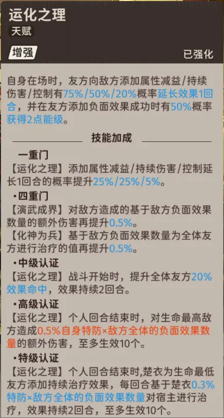 【楚衣】的核心技能,概率增加队伍给敌方添加的负面效果的持续时间,在解锁中级认证之后,可以在战斗开始时提升全队友军20%的效果命中,加快负面队伍的启动,高级认证和特级认证会在【楚衣】个人回合结束之后,对敌方血量最高、己方血量最低的目标,基于自身的特殊防御和敌方全体的负面效果数量,分别造成伤害、持续治疗效果,【楚衣】的核心技能让【楚衣】的阵容搭配变得相当明确,也就是需要搭配可以范围施加负面效果的角色。