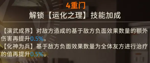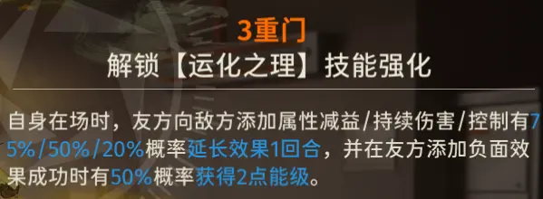 - 【造化之理】高级认证的额外伤害需要在敌人全体最少拥有一个负面效果时才会造成伤害,并且存在一个伤害下限,最低会造成角色攻击力×5%的伤害值,如果额外伤害通过特殊防御计算出来的伤害值低于伤害下限,则会造成角色攻击力×5%的伤害值。