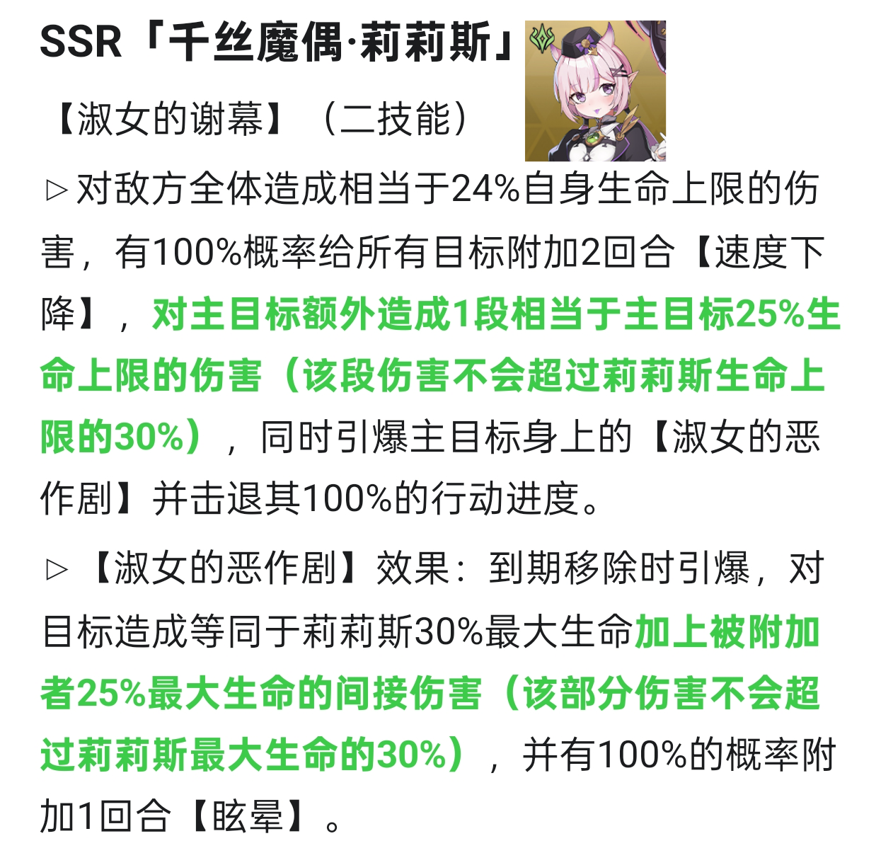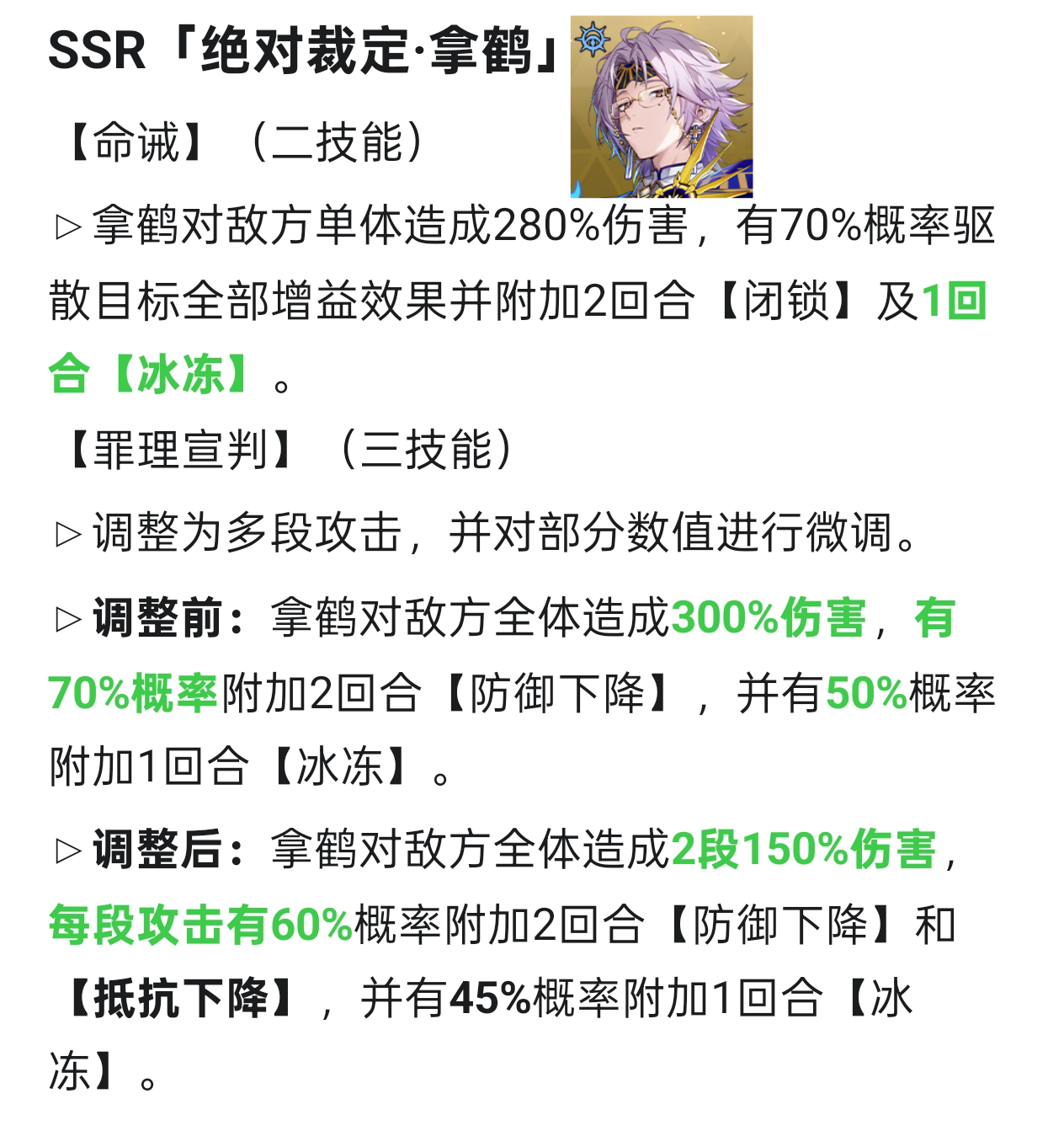 小技能增加一回合冰冻,终结技改为两段伤害间接提升概率,可以解放一个右位效果命中转去携带生命值百分比或效果抵抗,如果AI判定可以调整一下,PVP表现会更好。目前可以在PVP作为控制位使用,PVE处境依旧尴尬。