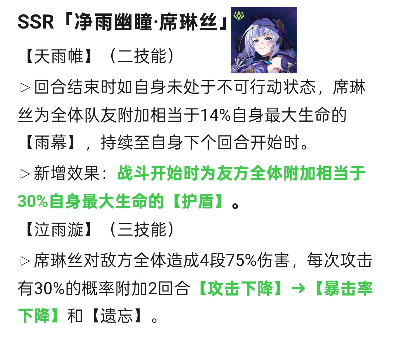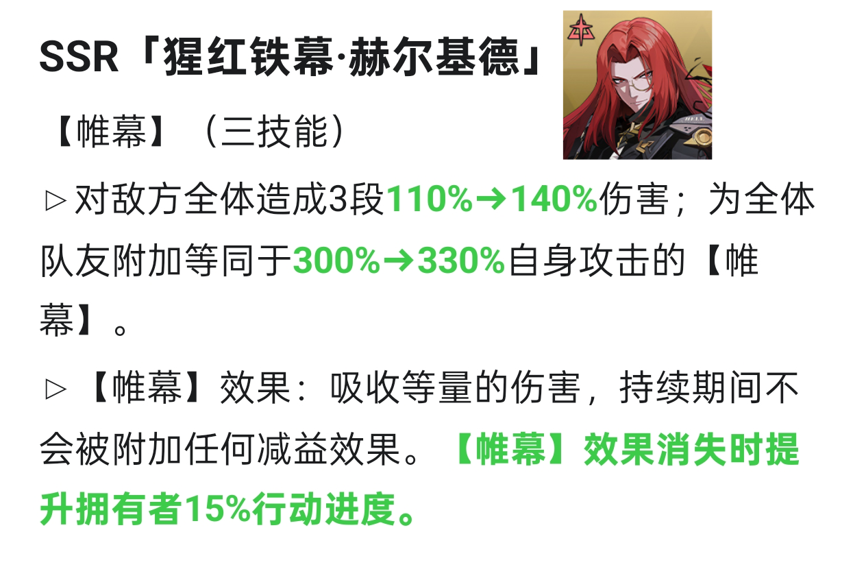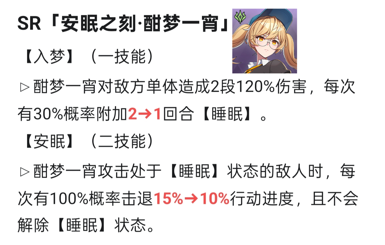 新增开局护盾,可以作为快攻队的策略卡上阵,终结技的攻击下降转为暴击下降也可以很好的保护队友,PVP强度大幅提升,PVE强度有上升但不多