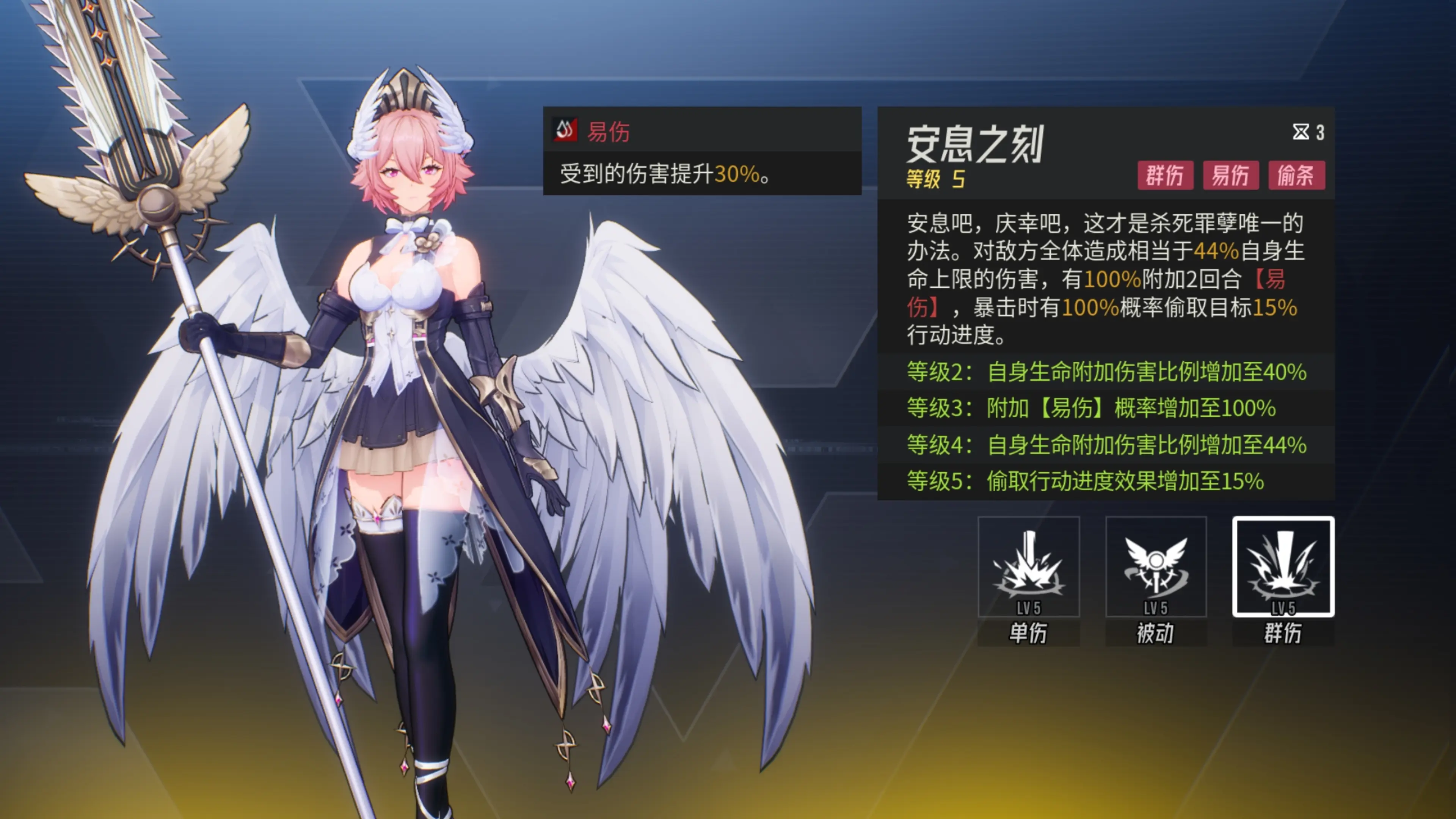 瑞玛丽的终结技会对敌方全体造成伤害并附加易伤,暴击时会偷取目标行动进度