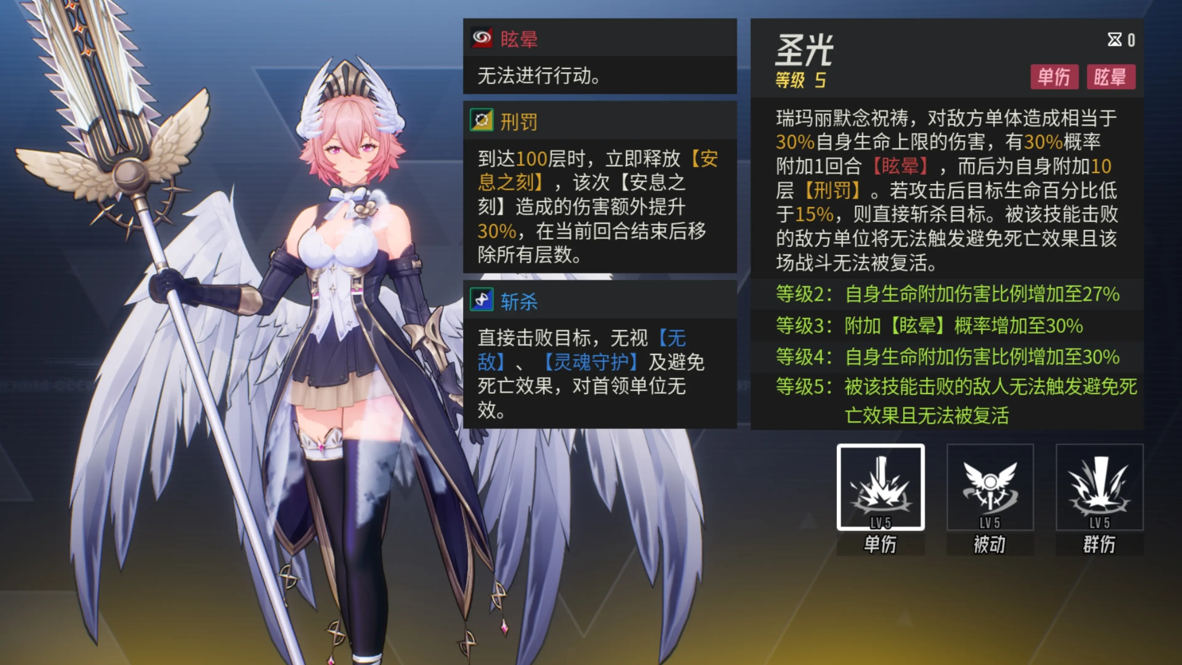 瑞玛丽的普攻会对敌方单体造成伤害,并有概率附加眩晕,而后为自身附加一定层数刑罚,刑罚达到最大层数后瑞玛丽会立即释放终结技,然后清除神罚的所有层数