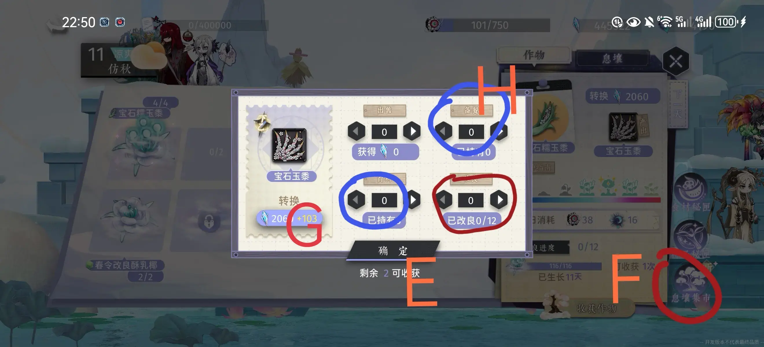 二,种菜。从菜的价值上,可以通过改良E或者买入更好的菜种F来提高菜的单产价值。而想卖高价就必须应季(一般春秋可以混着种)(冷,中,热)。改良是通过一定次数来实现培育新品种,新品种少可以通过育种G增加种子,1:3转换。