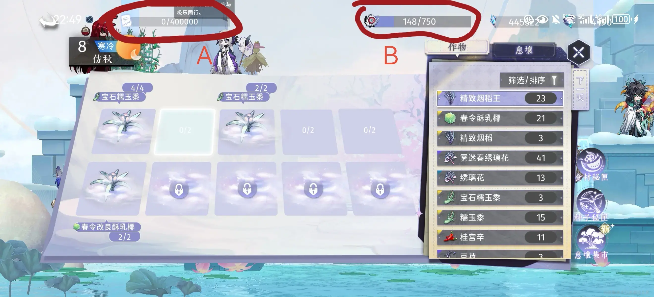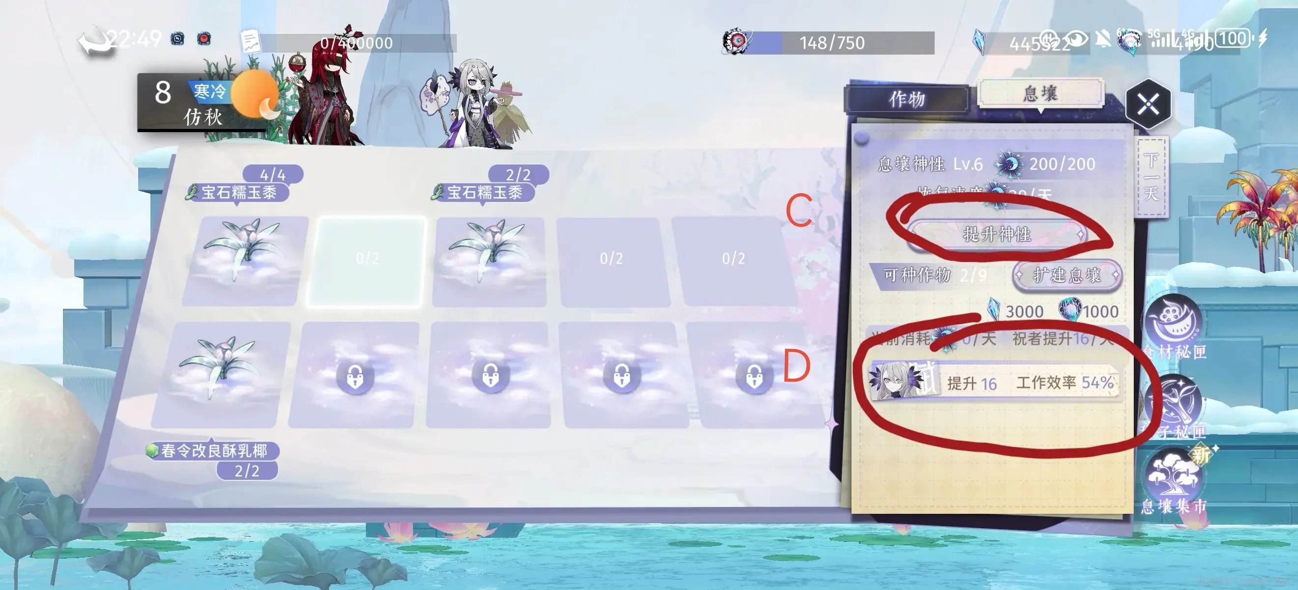 息壤界面(C,D图)可以看到每天土地息壤自回速度,祝者提升和当前消耗。自回速度+祝者提升>当前消耗时,菜品质为乙及以上。