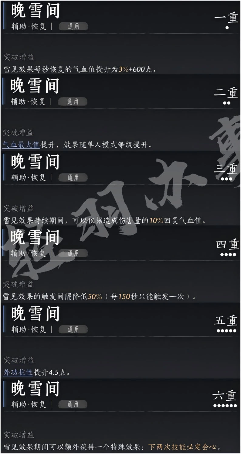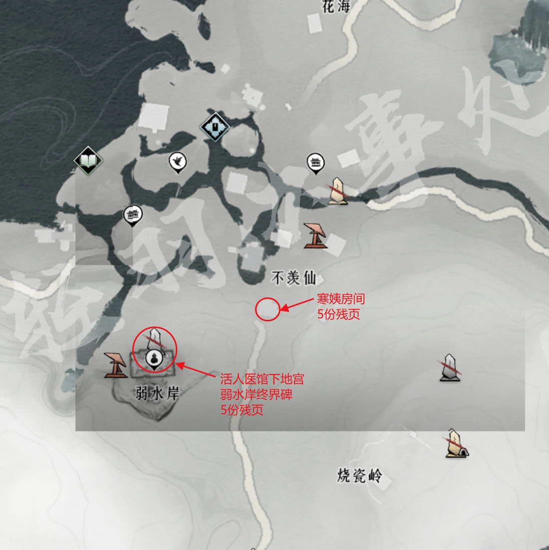 晚雪间(通) | | 清河·不羡仙寒姨房间内宝箱获得5份残页;清河·活人医馆下地宫内,弱水岸终界碑房间内宝箱获得5份残页,然后在背包里将残页合成即可 | |