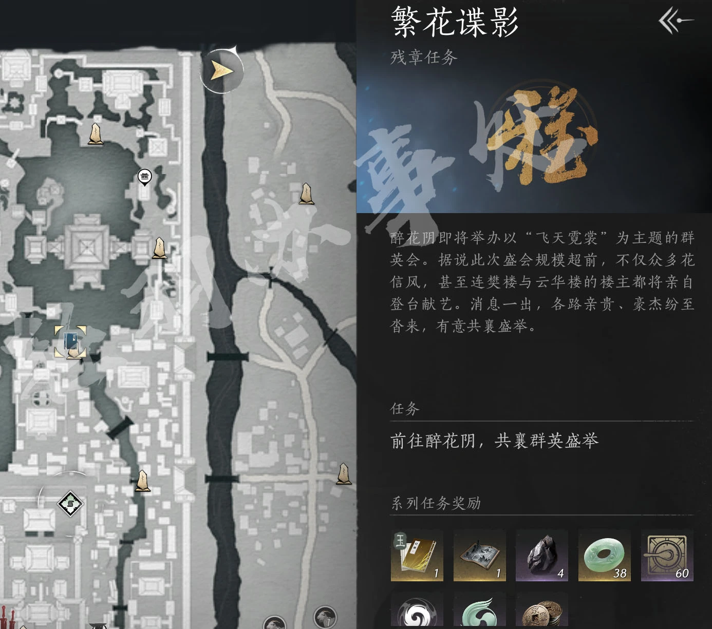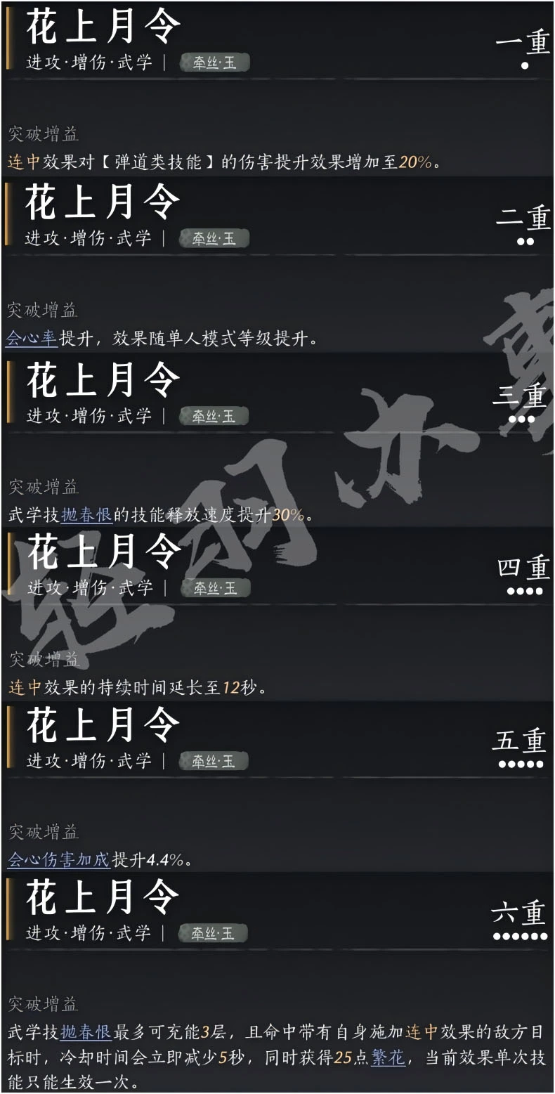 花上月令(丝) | | 完成开封·侠迹卷二·繁花谍影 线索1:与1楼花解语比拼投壶获胜 线索2:与1楼凌玉茗比拼丝竹雅韵获胜 线索3:偷取2楼傅蓉身上《礼单》 线索4:与2楼贾文曲比拼话术获胜 线索5:与3楼温子轩一起跳舞 线索6:与3楼任嘉钰、黄素馨对话 线索7:设法进入3楼包厢调查 | |